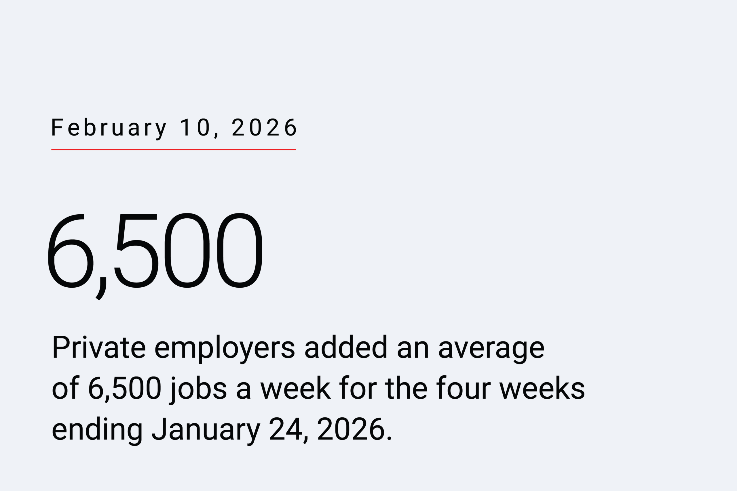 For the four weeks ending January 24, 2026, private employers added an average of 6,500 jobs a week, a step up in hiring from the previous week. These numbers are preliminary and could change as new data is added. Download this week’s NER Pulse data.