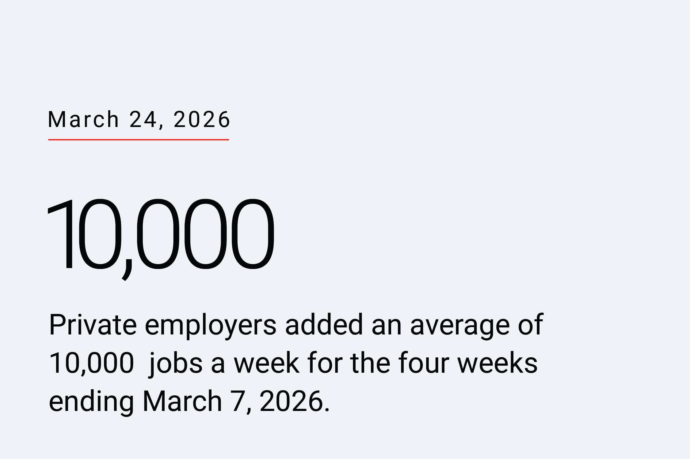 For the four weeks ending March 7, 2026, U.S. private employers added an average of 10,000 jobs a week. Employment gains for the first week in March were little changed from the previous week. The latest NER Pulse is now live. Download this week’s NER Pulse data.
