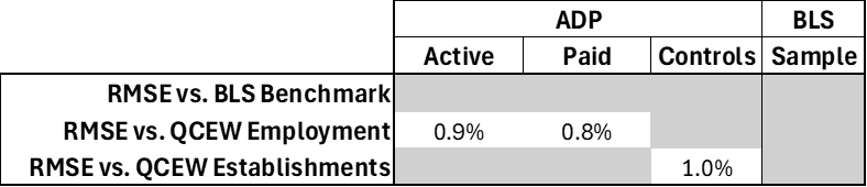 We compare ADP’s administrative payroll data to the universe of U.S. employees as measured by the Bureau of Labor Statistics (BLS) Quarterly Census of Employment and Wages (QCEW). We also compare ADP data to the BLS Current Employment Statistics (CES) survey data, which is used to construct the BLS non-farm payroll report each month.