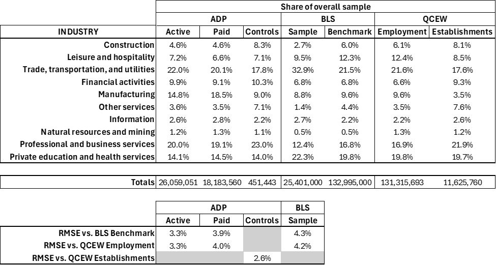 We also compare the ADP sample by paid and active employment. Again, these shares are roughly aligned to the QCEW, with the biggest divergence in manufacturing.