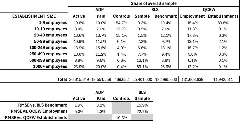 For example, as seen in Table 2 of the Appendix, employers with fewer than 50 people make up 32.4 percent of active employees, 31.3 percent of paid employees, and 87.5 percent of payroll accounts in ADP data. This compares to 43.9 percent of employment and 96.3 percent of establishments in the QCEW sample.