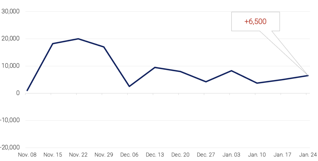 For the four weeks ending January 24, 2026, private employers added an average of 6,500 jobs a week, a step up in hiring from the previous week. These numbers are preliminary and could change as new data is added.