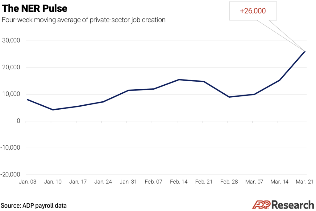 For the four weeks ending March 21, 2026, U.S. private employers added an average of 26,000 jobs a week. It was the fourth straight week of improvement in hiring. These numbers are preliminary and could change as new data is added.