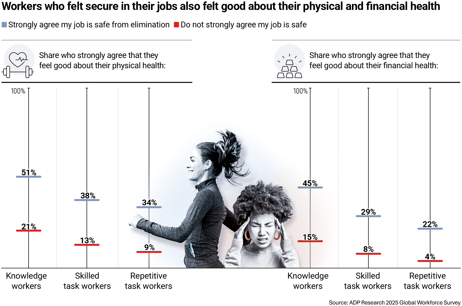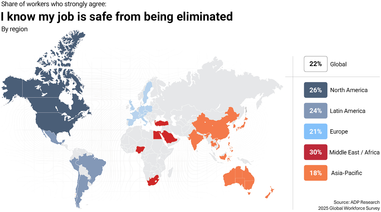 Just 22 percent of respondents to our 2025 Global Workforce Survey strongly agreed that their job was safe from elimination, a share that was little changed from 2024. Anxiety over job security was particularly acute among lower-paid repetitive task workers and people at the bottom of the management hierarchy.1In 2025, the ADP Research Global Workforce Survey elicited responses from more than 39,000 workers in 36 markets between July 21 and August 4.