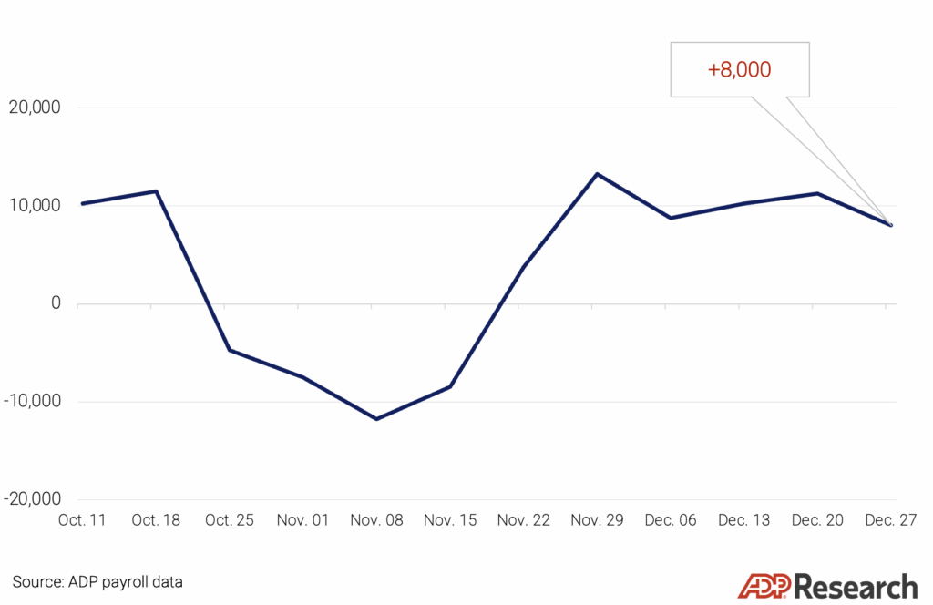 For the four weeks ending Dec. 27, 2025, private employers added an average of 8,000 jobs a week. The last week of 2025 showed a modest slowdown in hiring.