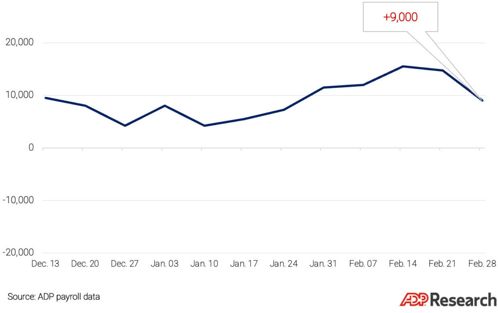 For the four weeks ending February 29, 2026, U.S. private employers added an average 9,000 jobs a week. After several weeks of strengthening, hiring took a step back at the end of February. These numbers are preliminary and could change as new data is added.